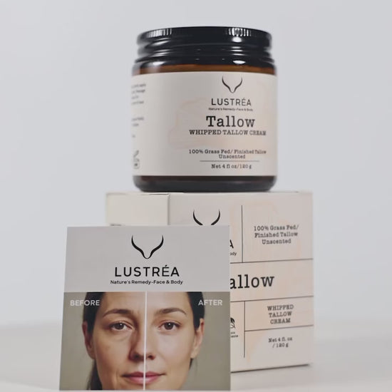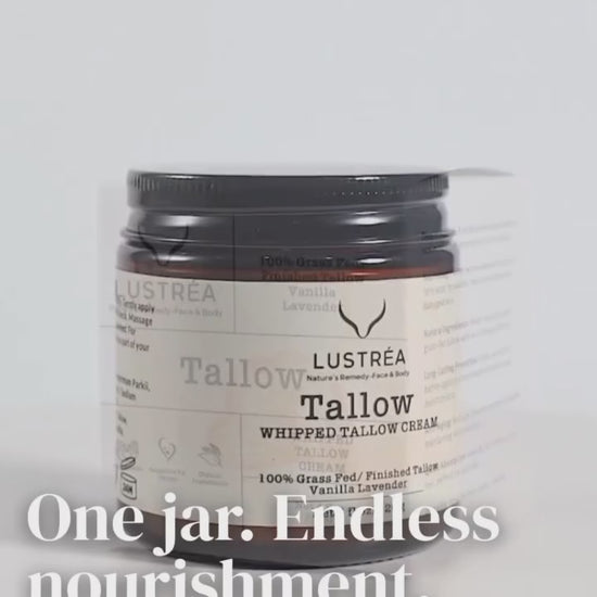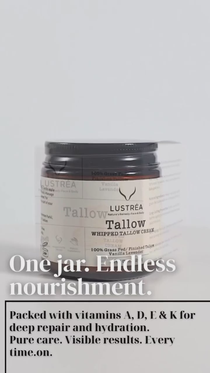 LUSTRÉA Whipped Tallow Cream delivers intense hydration and repair for dry, flaky, or sensitive skin with grass-fed beef tallow rich in vitamins A, D, E, and K. Its fast-absorbing, non-greasy formula soothes eczema, psoriasis, and irritation while boosting cell renewal and collagen for smoother, more elastic skin. Safe for all ages, it works as a facial moisturizer, belly balm, or diaper cream, and is crafted from clean, cold-processed ingredients with natural emollients and omega-9 fatty acids. Infused with calming vanilla and lavender, it offers a spa-like, skin-nourishing experience perfect for your nighttime or post-shower ritual.